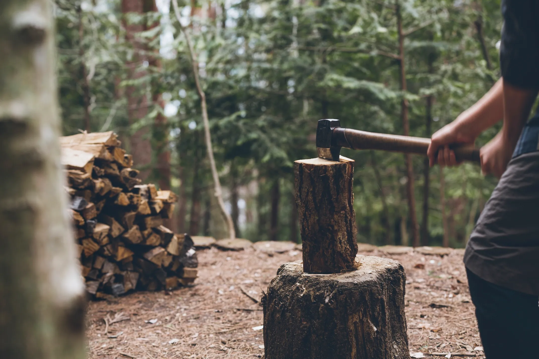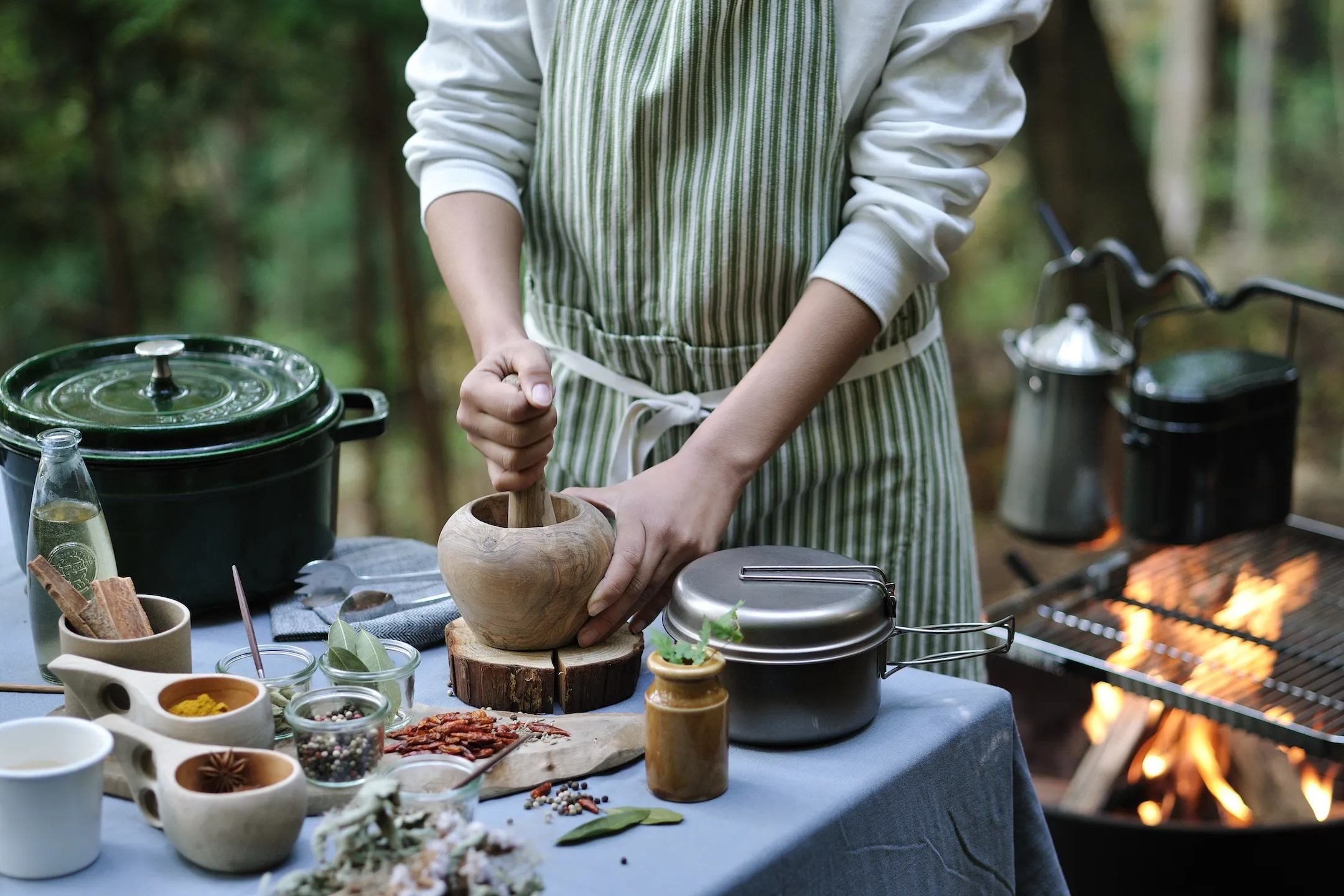 チャイとカレーのスパイスランチは、火おこしや、アウトドア機材を用いた、仕上げの行程も含めて楽しみます。まずは、森を知り尽くしたグランピングマスターと一緒に薪を割り、火おこしを体験します。チャイは自分でおこした焚き火で温めながら、じっくり香りを引き出して仕上げます。カレーは好みのスパイスを調合して味を調え、ご飯はダッチオーブンで炊くところから挑戦します。炎を扱いながら作業をすすめ、スパイスを身体に取り込むことで発汗を促し、身体にこもった熱を外に逃します。