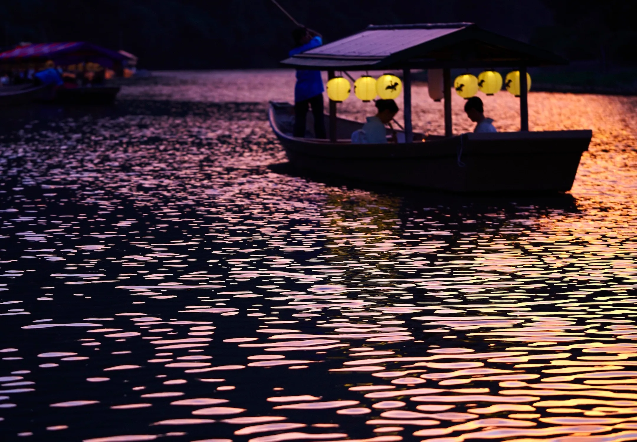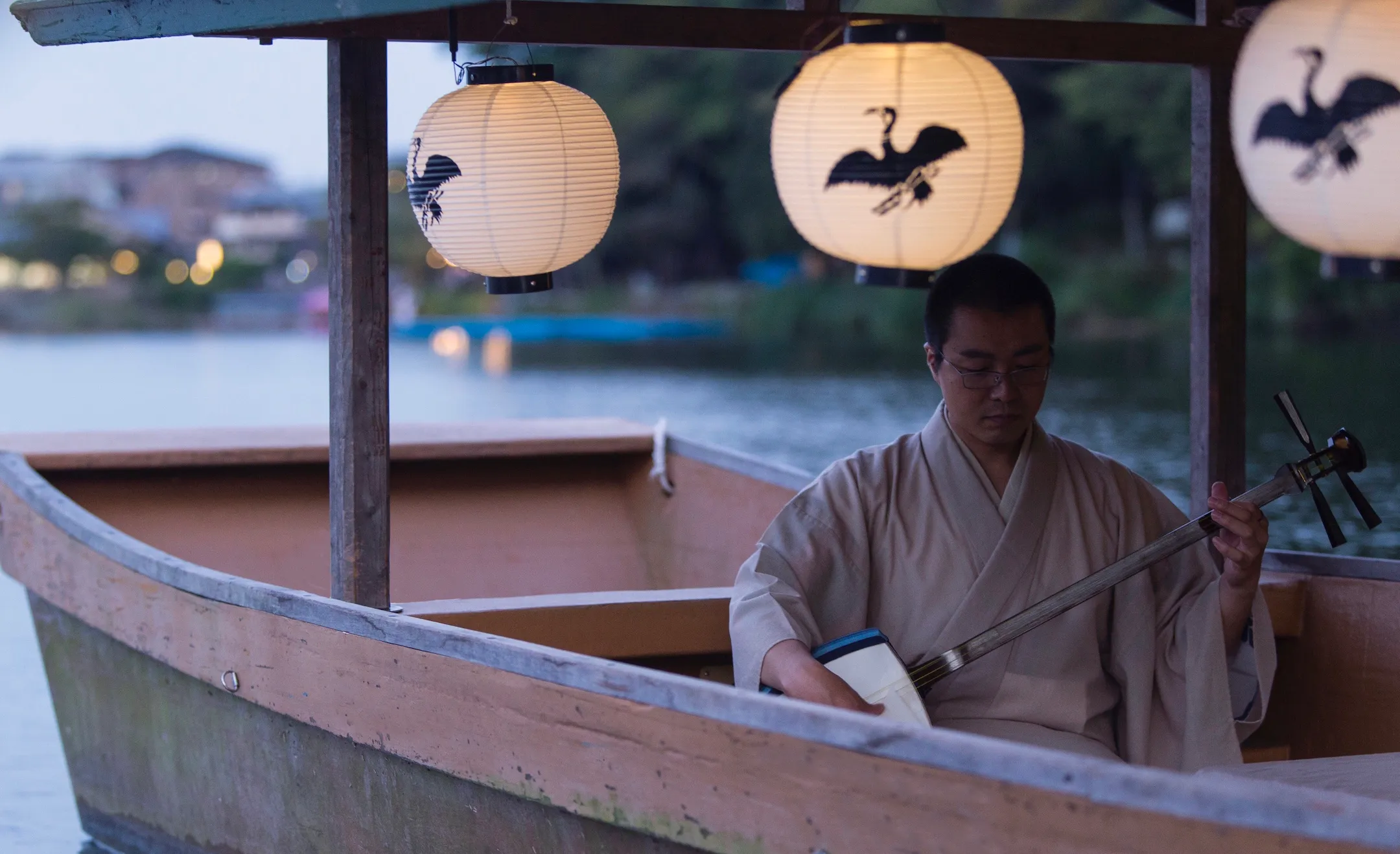 星のや京都の前から船に乗り、10分程かけて鵜飼の開催場所まで向かいます。その間、船内では三味線の生演奏を行います。三味線の音色は暮れゆく静かな奥嵐山の渓谷にこだまし、鵜飼鑑賞の高揚感を演出します。三味線を聞きながらの船遊びは、星のや京都の鵜飼鑑賞船だけの特別な夏の過ごし方です。