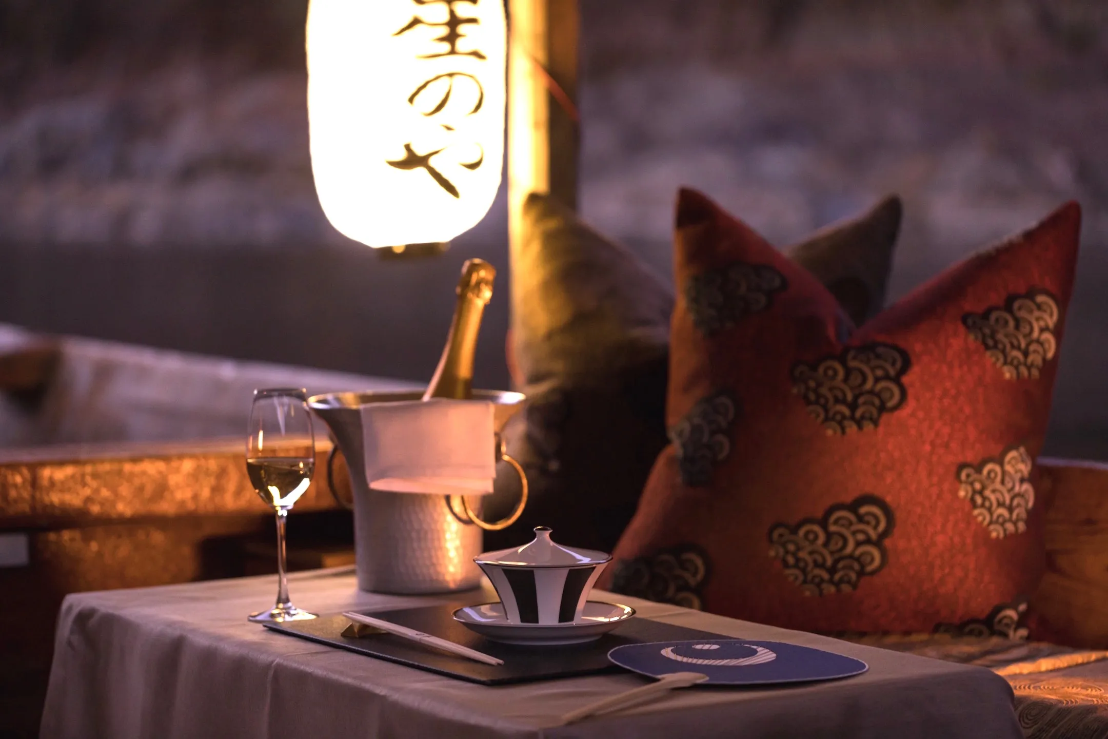 一般の鵜飼鑑賞船は乗り合いですが、本アクティビティは1日1組限定の貸し切り船で催行します。星のやの提灯がかけられた船の中には、クッションや背もたれが設えられています。そのため、プライベートな空間でくつろいで食事と鵜飼鑑賞を楽しむことができます。