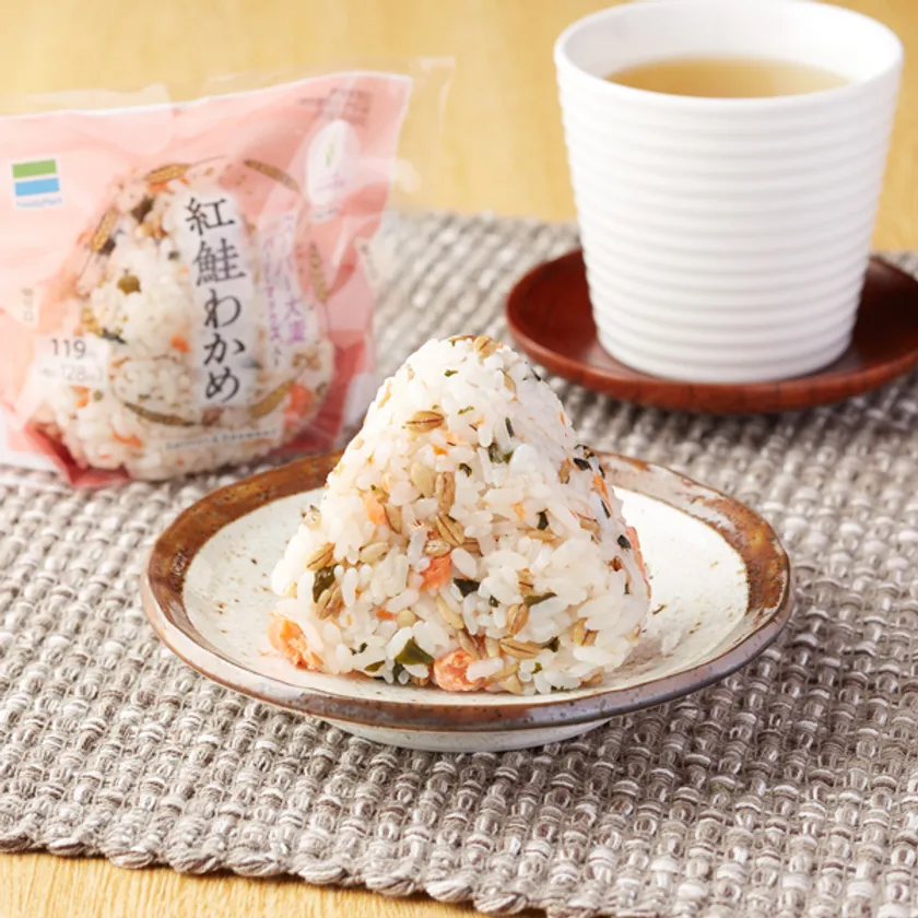 一晩熟成させ炙った紅鮭と、わかめを合わせたシンプルな混ぜおむすびです。噛むとプチプチとしたスーパー大麦の食感と、だしの風味が味わえる仕立てです。