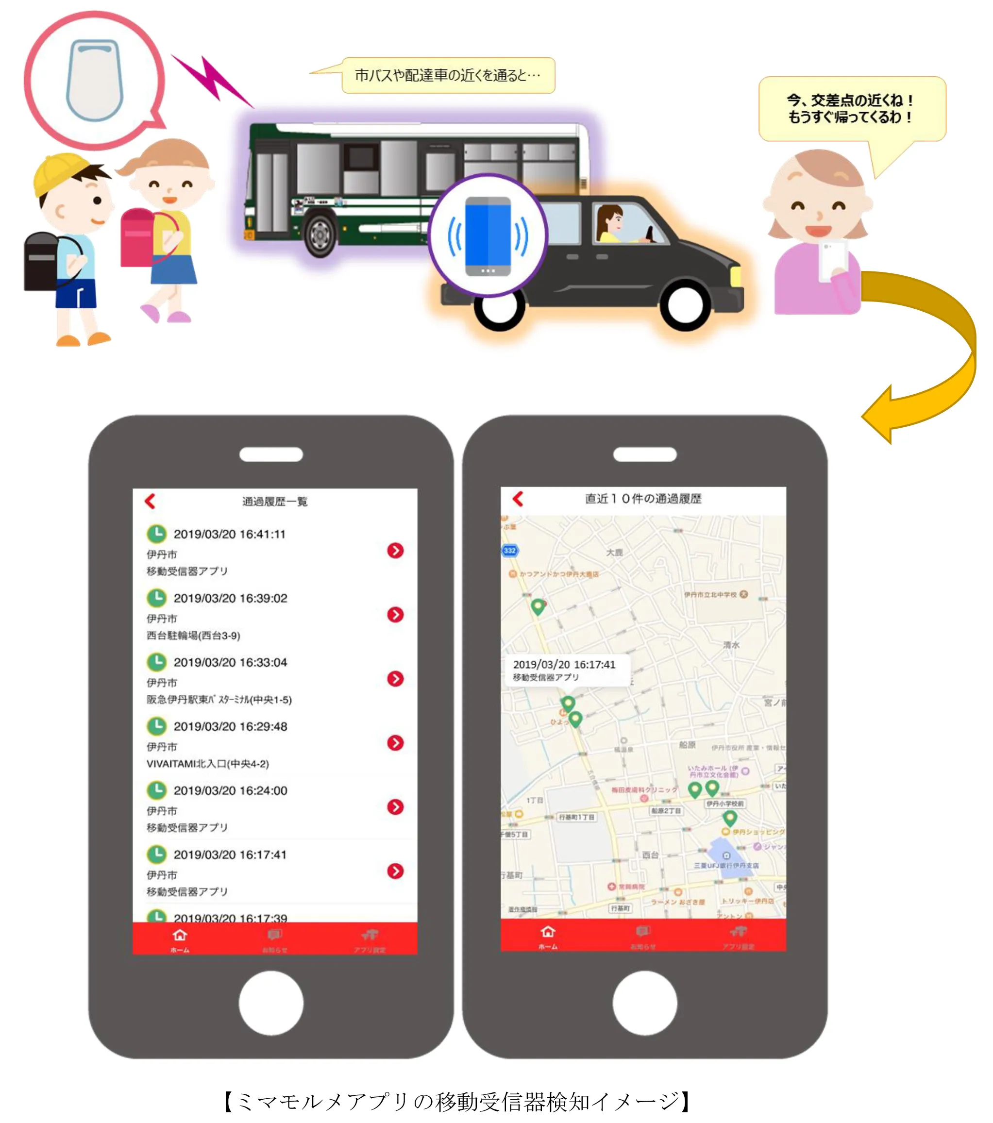 この度の実証実験は、既存の固定受信器に加え、市内を移動する車両に移動受信器アプリをインストールしたスマートフォンを搭載することで、「まちなかミマモルメ」の検知エリアを広げ、サービスの強化を図るものです。