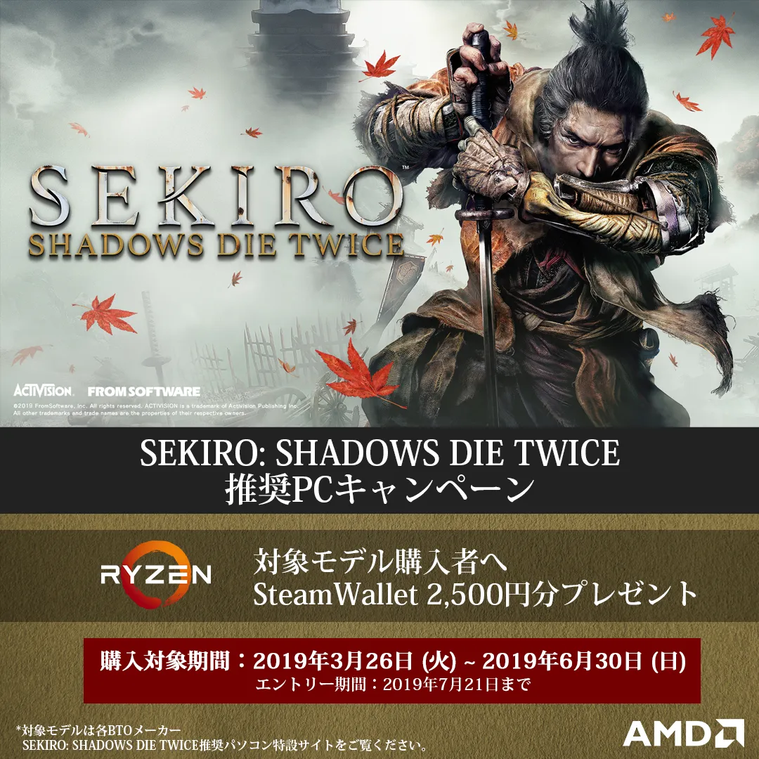 キャンペーン期間中に、AMD Ryzen(TM) 7 2700X / 2700、Ryzen(TM) 5 2600X / 2600 プロセッサー搭載SEKIRO: SHADOWS DIE TWICE 推奨パソコンをご購入頂くと、もれなくSteam Walletデジタルコード2,500円分をプレゼントいたします。