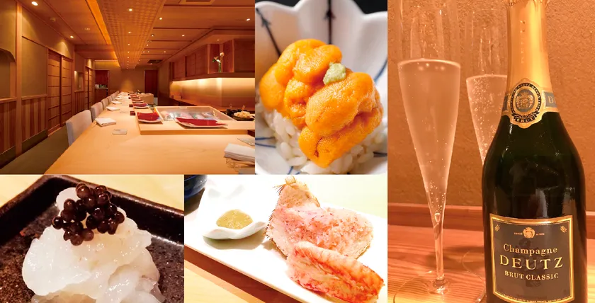 コース内容は、先付、旬の刺身、白海老とキャビア、毛蟹、9貫の握りと巻物、デザートに『ドゥーツ ブリュット・クラシック』のハーフボトルが付いたコースで2時間から2時間半くらいかけてゆっくりお酒やつまみ、にぎりを愉しむことができます。