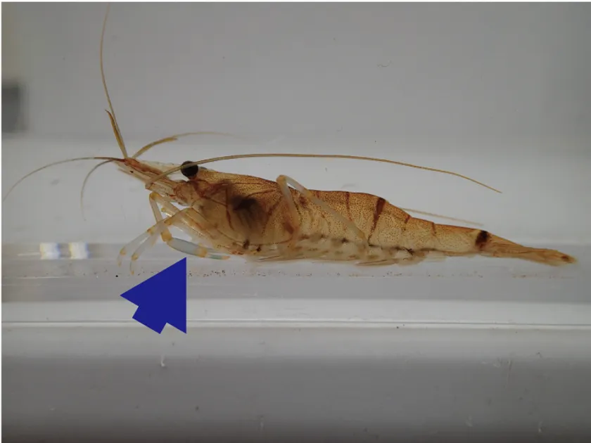 図1.キタノスジエビ 第二胸脚のハサミ部(矢印)の長さが特徴