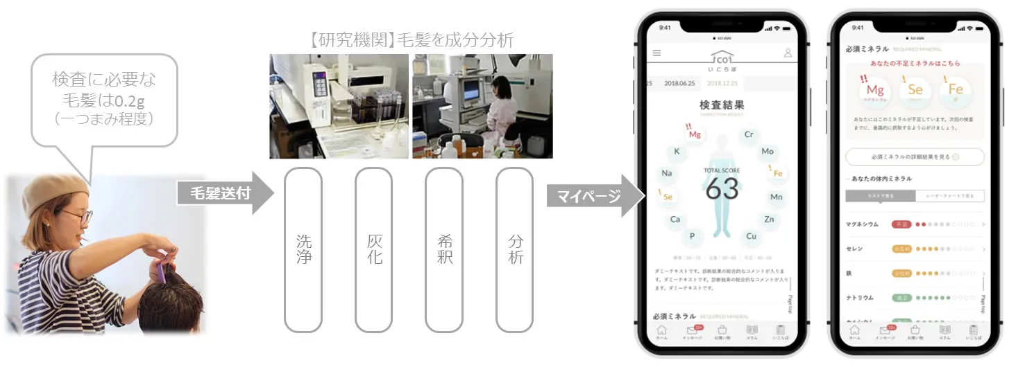 「いこらぼ」は専門検査機関と提携し、美容室でカットした毛髪を分析し、カルシウムや亜鉛など必須ミネラル12種や、水銀やヒ素など有害金属5種の含有量を検出できます。