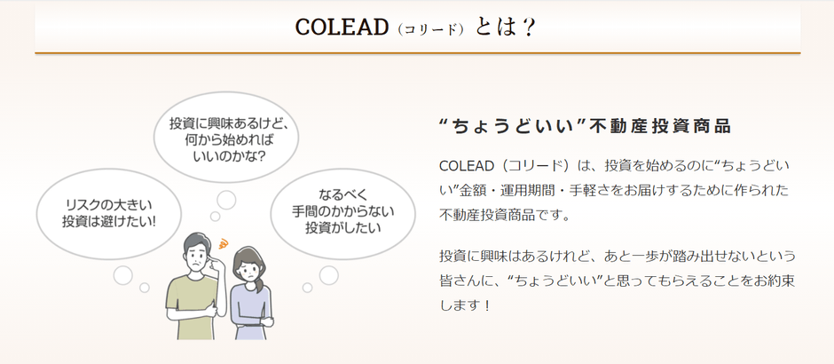 COLEADは1口50~100万円から出資可能とすることで、不動産投資の敷居を下げ、より多くの方に始めて頂きやすい不動産小口化商品を目指しました。