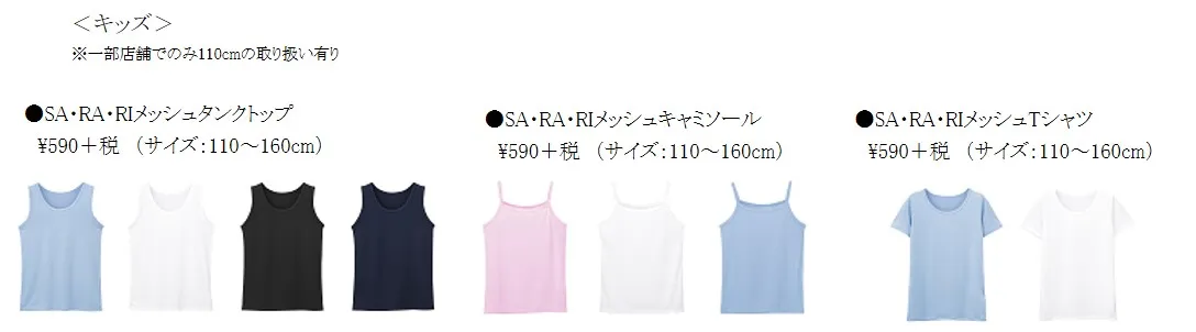 メンズは、半袖Tシャツ、タンクトップ、ボクサーパンツをはじめインナーのラインが目立たないシームレスタイプを、レディースは、キャミソール、タンクトップのほかブラトップを、キッズはメッシュ素材の半袖Tシャツ、タンクトップ、キャミソールをご用意いたしました。また、メンズ・レディースでは、ルームウェアも登場します。