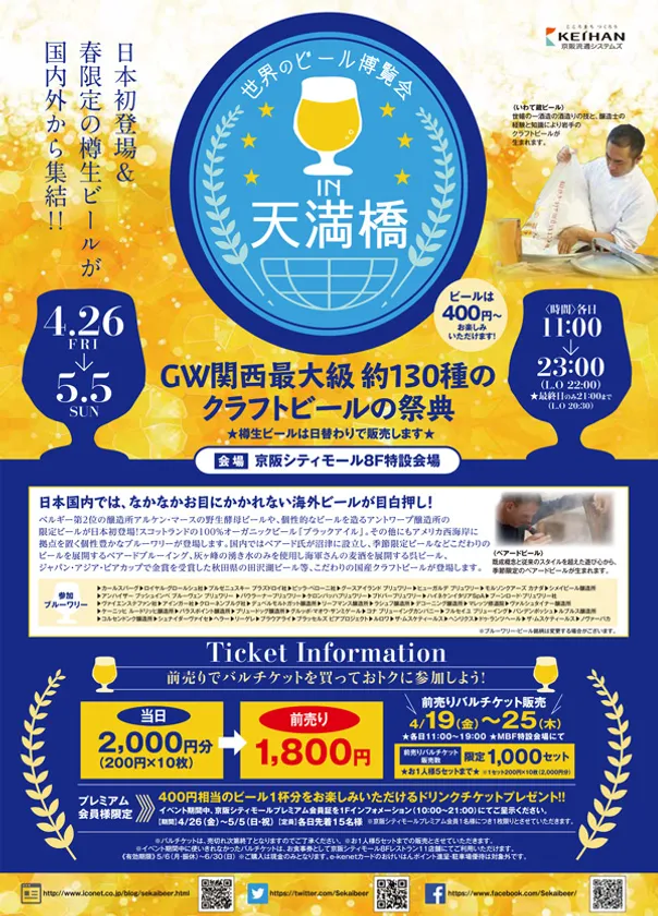 各種ビールは400円からお楽しみ頂けます。お得な前売り券は1,800円(通常価格2,000円)。京阪シティモールMBF特設会場にて、4月19日~25日(11:00~19:00)の期間中販売します。