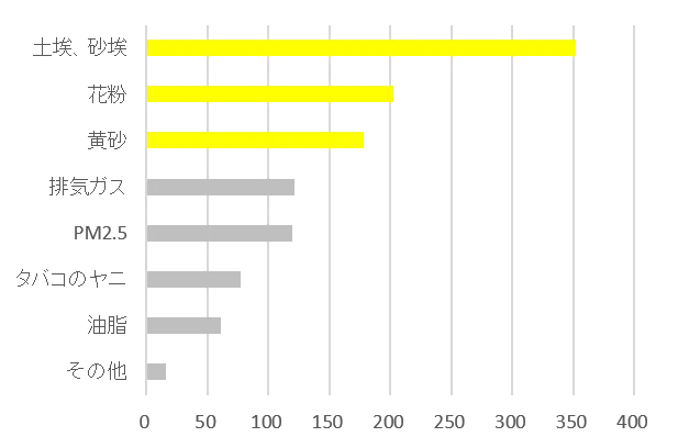 網戸に付着する汚れの種類で何が気になるかを聞いたところ、回答が集中したのは、「土埃・砂埃」でした。