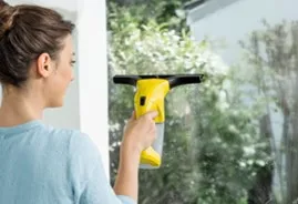 窓の拭きあげを。電動で水を吸引するので拭き跡が残らず、