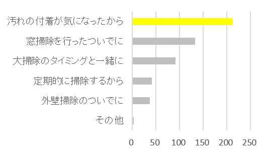 網戸掃除は「汚れの付着が気になったタイミングで行う」という方が多い一方で、掃除を行う頻度が「半年に1回以下」と答えた方の割合は61%にのぼり、汚れが気になってもこまめに掃除ができていないことがわかりました。