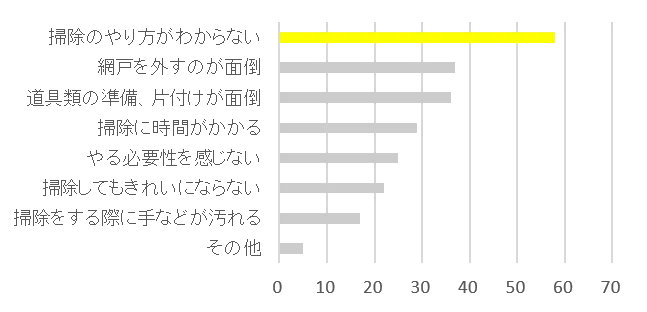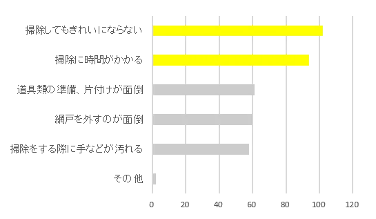 網戸掃除をしている方に、今の網戸掃除に満足しているか聞いたところ、「不満がある」、「やや不満がある」と答えた方が過半数の54%にのぼりました。「不満がある」、「やや不満がある」と答えた方に、網戸掃除の何が嫌かを聞いたところ、「掃除してもきれいにならない」、「掃除に時間がかかってしまう」という声が多くあがりました。また、網戸掃除をしない理由では、「掃除のやり方がわからない」がトップに。網戸は時間をかけて掃除をする割に、なかなか綺麗になった実感を得られない場所であるとともに、どのように掃除をしていいのかわからない場所でもあることがわかりました。