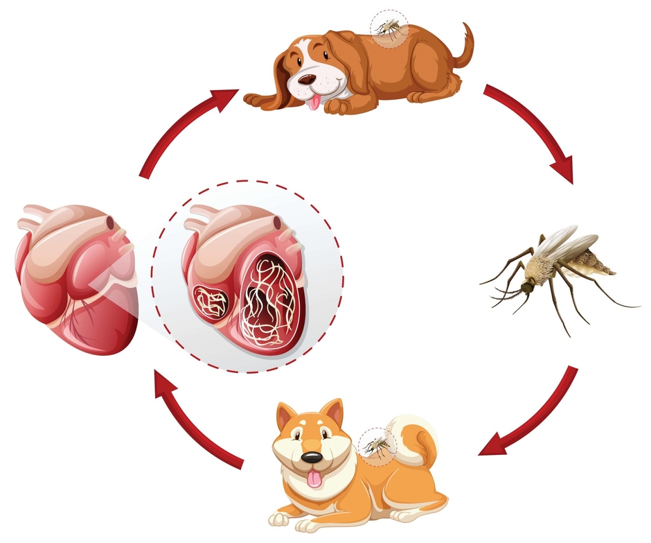 蚊がフィラリアに感染している犬の血を吸って、ミクロフィラリアが蚊の体内に入り、蚊の体内でミクロフィラリアが感染幼虫になります。