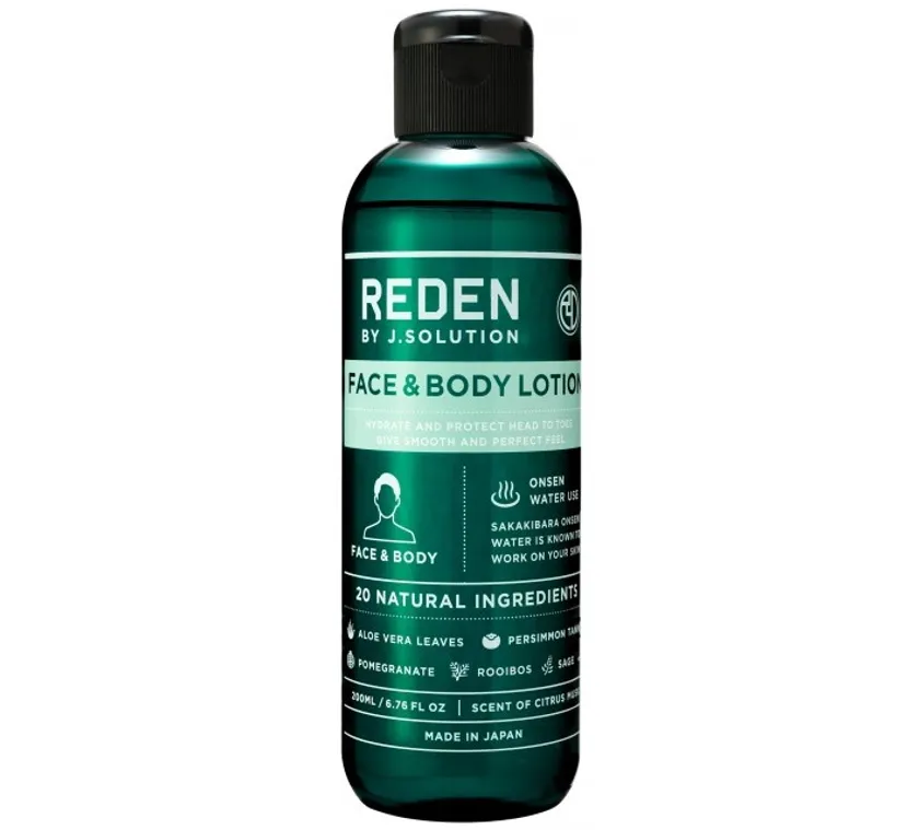「リデン フェイス&ボディローション」は、榊原温泉水と20種類の天然由来成分を配合した頭皮から足先まで使える全身用化粧水です。さっぱりとした使用感でありながら、しっかり保湿し、つるすべ肌へ導きます。(人気のシトラスムスクの香り)