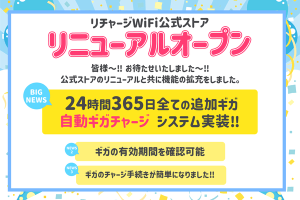 【リチャージWiFi】公式ストア リニューアルオープン‼24時間365日いつでもギガチャージが可能に‼更にギガの有効期間の確認が出来たり、大幅な機能の拡充をいたしました。