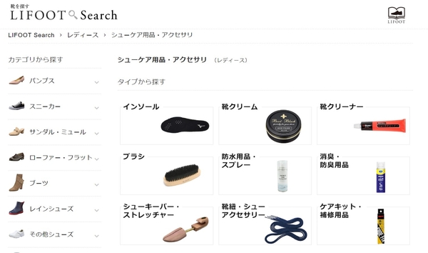 「ライフットサーチ」では、シューケア用品の項目をご用意しており、「まめ」「タコ」など足のお悩みケアグッズは勿論、靴の防水スプレー、シューレースなどの靴小物もお探しいただけます。