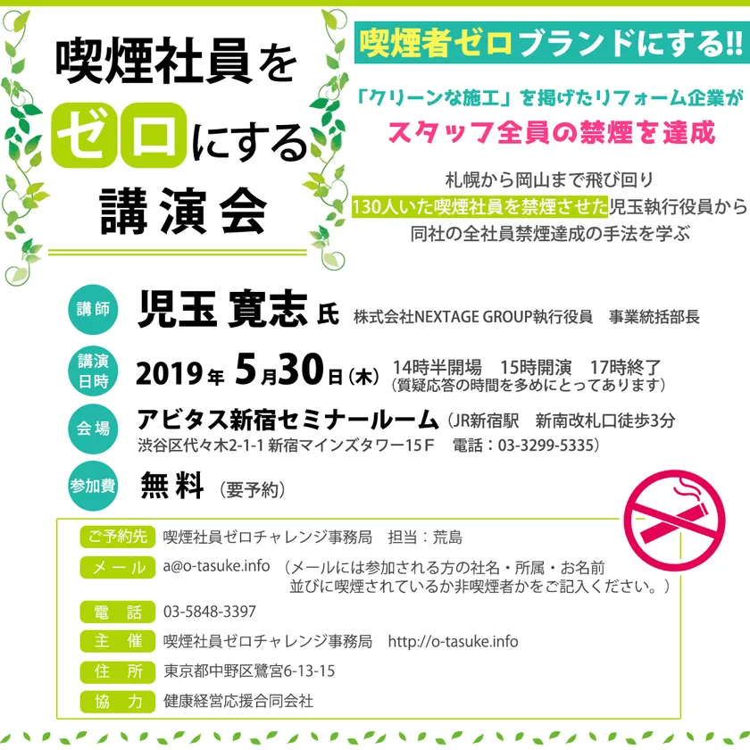 喫煙社員をゼロにする講演会 「喫煙者ゼロ ブランドにする!!」を5月30日に開催