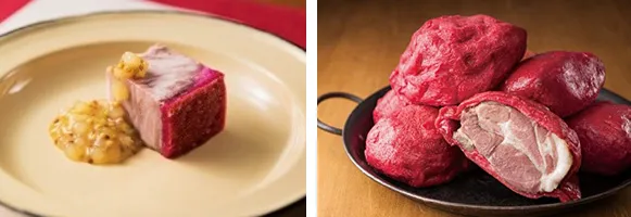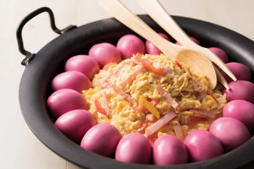 たまご好きにはたまらない!赤色に染まったゆで卵とハムやパプリカが入ったスクランブルエッグを組み合わせた、たまご on たまご料理。