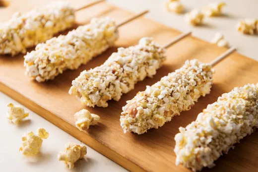 辛子マヨをぬったフランクフルトにポップコーンをまとわせたアイデアメニュー。