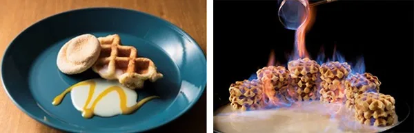 積み重ねたワッフルにミルクソースを絡めフランベの演出で燃えあがる炎をナイアガラの滝に見立てました。