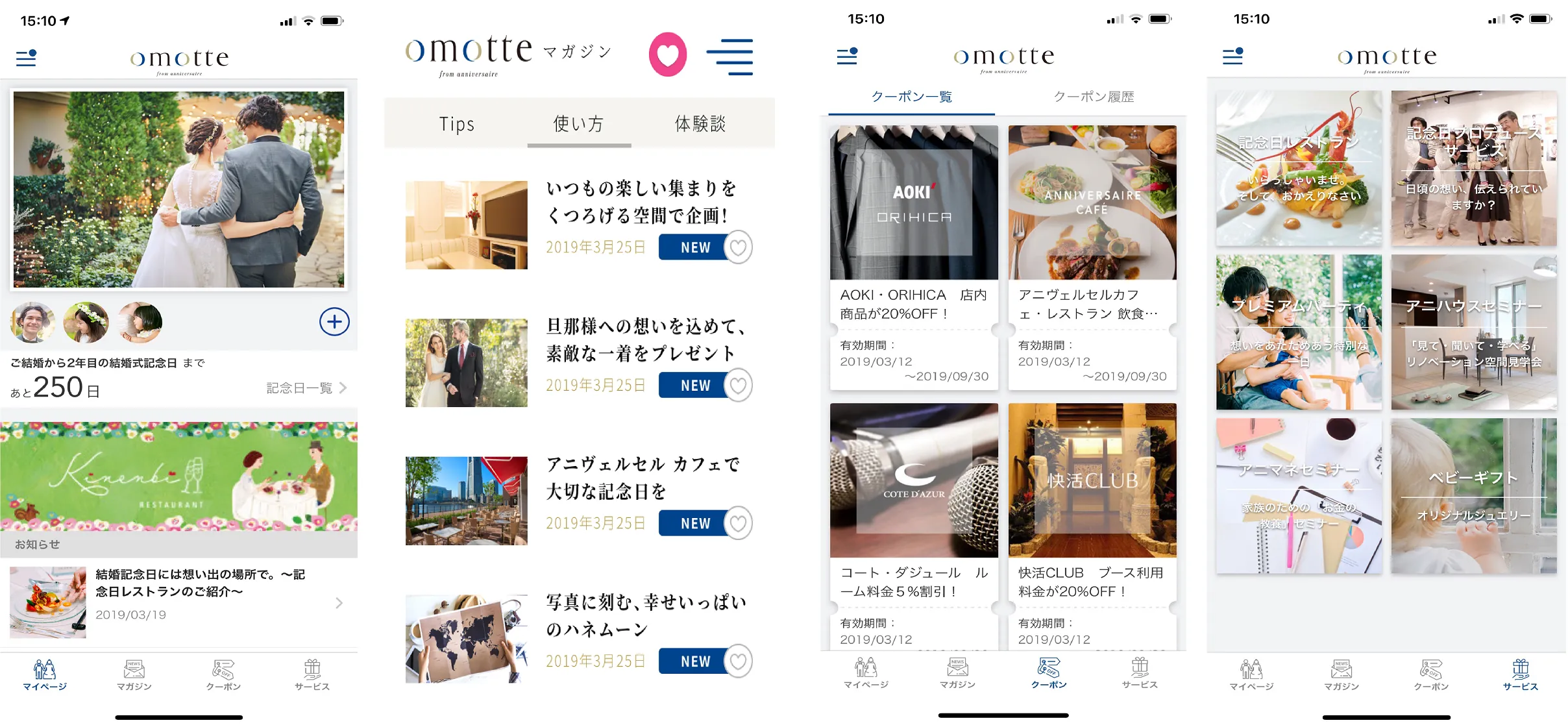 ▲アプリイメージ(左からマイページ、マガジン、クーポン、サービス)