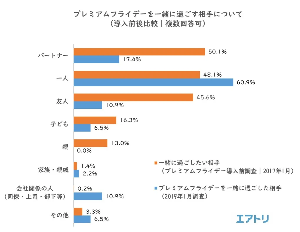 プレミアムフライデー導入前の2017年1月に実施した調査では、「プレミアムフライデーが導入されたら誰と過ごしたいですか?」という問いに対し、1位は「パートナー」(50.1%)、続いて「一人」(48.1%)、「友人」(45.6%)という結果でした。