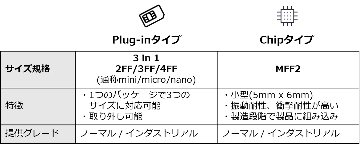 本サービスのSIMは、取り外し可能な「Plug-inタイプ」に加え、振動耐性・衝撃耐性に優れた組み込み用の「Chipタイプ」の2種類から選択可能です。また、両タイプ共に温度耐性や書き込み耐性を強化したインダストリアルグレードをお選びいただくこともできます。