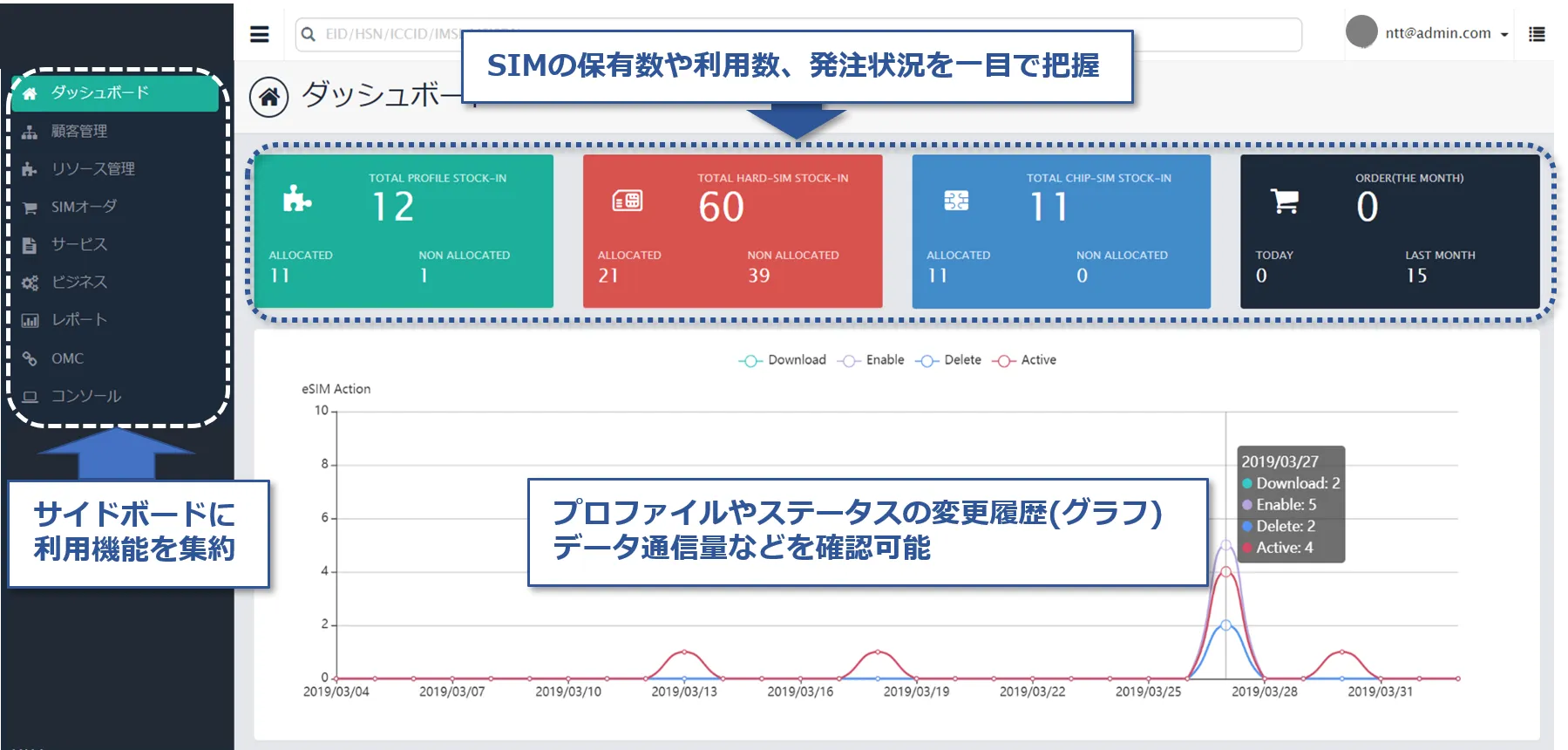 本サービスのWebポータルをご利用いただくと、ダッシュボードから契約されているSIM全ての利用状況などを視覚的に把握できます。