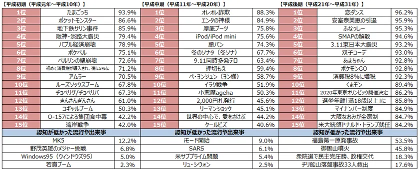■JKの認知が高かった平成の流行や出来事(上位15位)