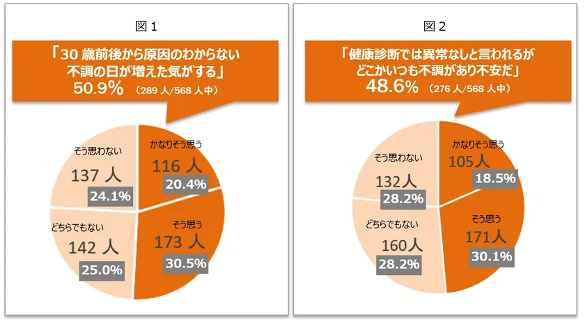 また、「健康診断では異常なしと言われるがどこかいつも不調があり不安だ」と答えている女性も48.6%(*図2)に及んでおり、彼女たちが体調不良の原因を特定できないことも不安視していることもわかりました。