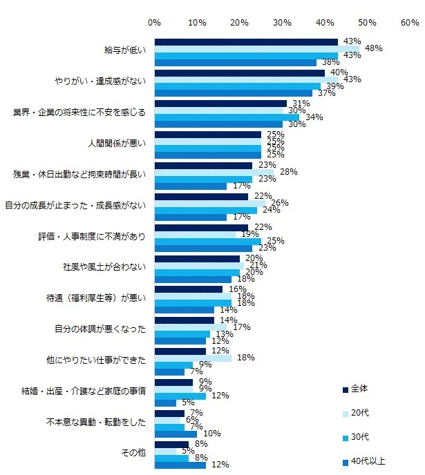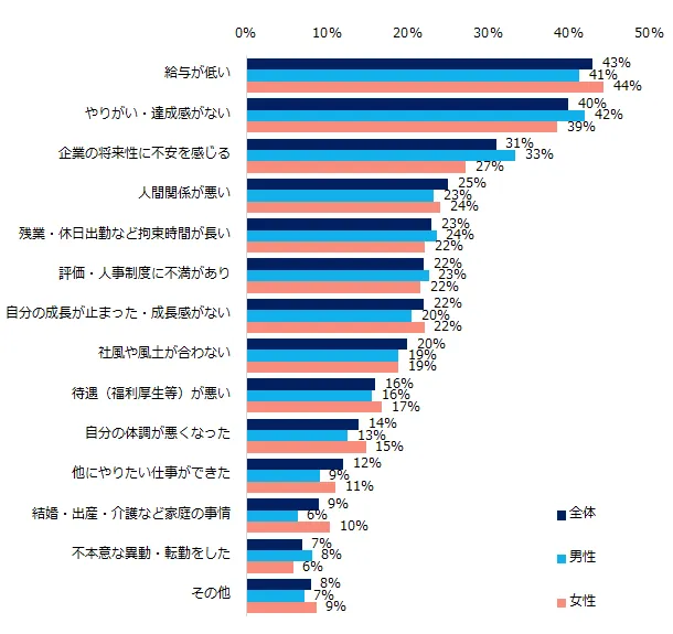 年代別に見ると、20代は「給与が低い」(48%)、「やりがい・達成感がない」(43%)、「残業・休日など拘束時間が長い」(28%)が他の年代よりも高くなっています。男女別の結果もご紹介します。