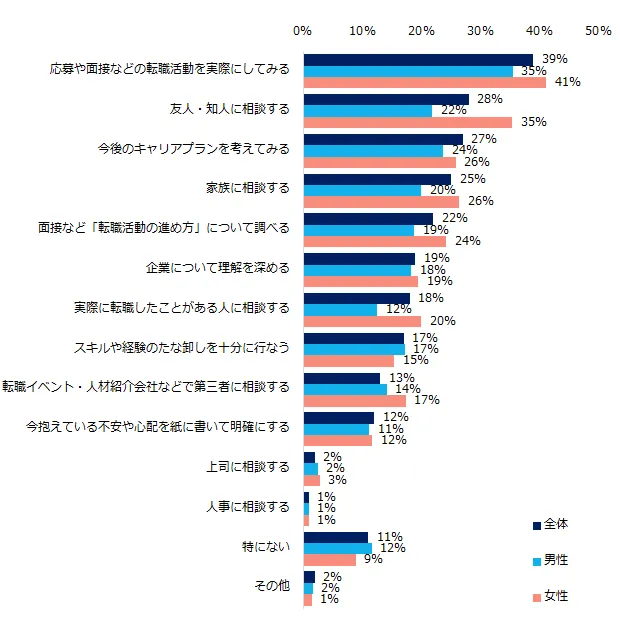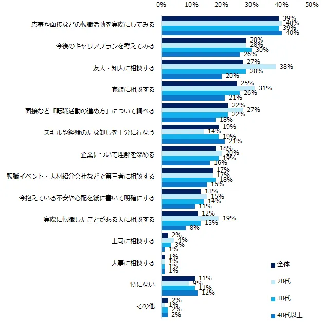 実際に転職経験の有無を伺ったところ、69%が「ある」と回答しました。転職経験者に、「不安な点・気になる点があった場合、実際にどうやって解消しましたか?」と伺うと、最も多い回答は「応募や面接などの転職活動を実際にしてみる」(39%)、次いで「今後のキャリアプランを考えてみる」(28%)、「友人・知人に相談する」(27%)でした。