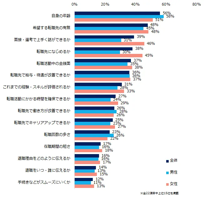 年代別に見ると、20代は「面接・選考で上手く話ができるか」(53%)、「転職先になじめるか」(44%)が他の年代よりも目立ちました。男女別では女性が「面接・選考で上手く話ができるか」(46%)、「転職先になじめるか」(44%)を多く挙げています。
