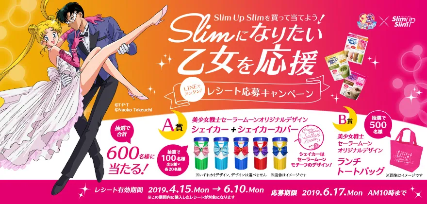 アサヒグループ食品株式会社は、2019年4月15日(月)より、ダイエットサポート食品「SlimUpSlim(スリムアップスリム)」と、武内直子原作のアニメ『美少女戦士セーラームーン』とコラボした、レシート応募キャンペーンを開始致します。※1