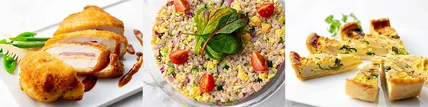 (左から)讃岐コーチン鶏ムネ肉のハムとチーズのパン粉焼き、善通寺産大師もち麦のサラダ仕立て、讃岐コーチンと有機豆乳をつかったキッシュ