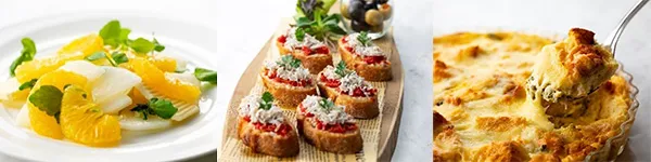 (左から)香川県産八朔と大根チーズの柑橘ドレッシング、瀬戸内ブルスケッタ、瀬戸内海苔を使ったパングラタン