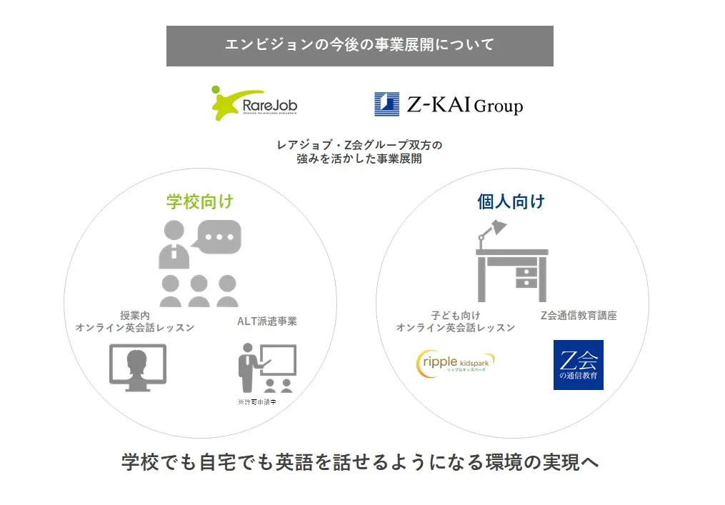 今後、エンビジョンでは“学校でも自宅でも英語を話せるようになる環境の実現”を目指し、レアジョブとZ会グループ双方の強みを活かして文教市場における事業展開を加速してまいります。