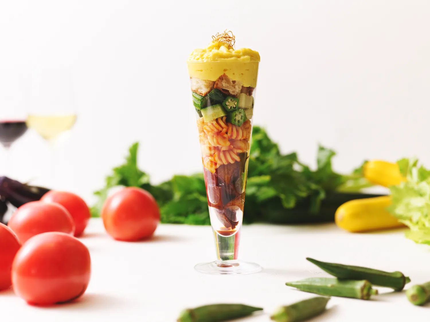 旬の野菜を使ったイタリア料理を提供するオットセッテがプロデュースするこのパフェは、4層で組み立てて、各層ごとにワインをペアリングして楽しみます。1層目は、トウモロコシの甘味をなめらかに仕上げた「トウモロコシのムース」、2層目はダイス状にカットしたパンにズッキーニなどを和えたイタリアの伝統料理「パンツァネッラ」です。1層目と2層目は、フレッシュで丸みのある「シャトージュン スパークリング」で味わいます。そして3層目は、トマトの酸味を楽しむ冷製ショートパスタ「トマトのフジッリ」に、軽やかな「丸藤葡萄酒 ルバイヤートロゼ」を合わせて、4層目のメインディッシュへとつなぎます。メインディッシュは、小芋を赤ワインとバルサミコで煮詰めた逸品です。ワインは木樽で熟成した「勝沼醸造 アルガーノ モンテ」を合わせます。マスカットベリーAの芳醇で柔らかな味わいで、コース料理を堪能したような余韻に浸ることができます。ベジパフェは、グラスの底までどこを食べてもおいしく、驚きにあふれたパフェです。