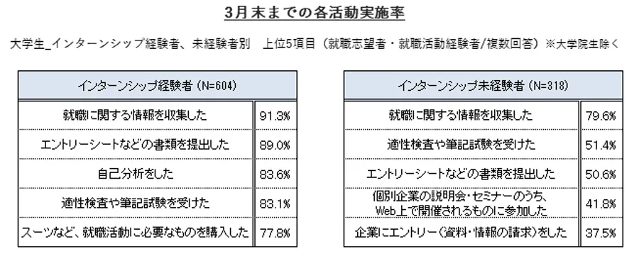 以下の表は3月末までの各活動実施率を経験者と未経験者別に見たものです。これを見ると経験者は「エントリーシートの提出」「適性検査の受検」などの選考参加に関する活動が、未経験者と比べて高くなっています。このことから経験者・未経験者で就職活動の段階に違いがあり、現在の就職内定率の差につながっていると考えられます。