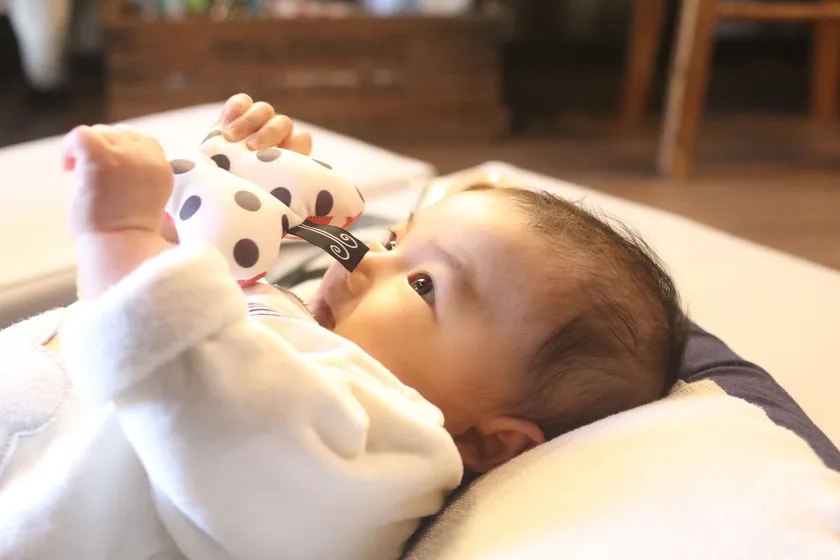 興味を持って握る赤ちゃん