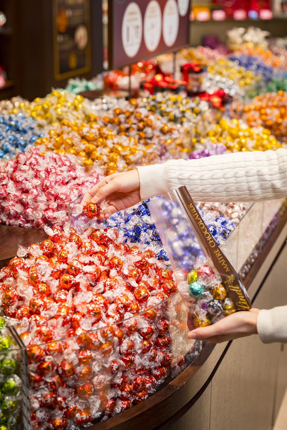 リンツの一番人気チョコレート「リンドール」をはじめとするリンツのバラエティー豊かなチョコレートから、お好きなフレーバーをお好きな量だけ量り売りでお求めいただけるリンツの直営店ならではの販売システム。