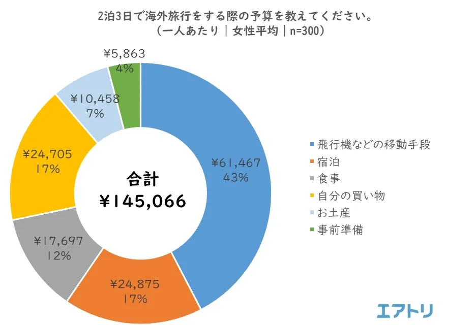 一方で、「自分の買い物」(男性6,363円 女性8,087円)、「お土産」(男性6,127円 女性6,600円)、「事前準備」(男性4,364円 女性4,478円)が、女性が男性を上回りました。男性が旅行に“移動手段”と“宿泊先”を重視しているのに対し、女性は“ショッピング”の予算に比重をかけていることが分かります。