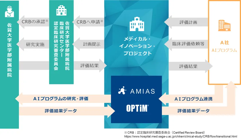 このたび、佐賀大学とオプティムは、国内外のAIプログラムメーカー向けに次世代医療の促進を目指すことを目的として本プロジェクトを立ち上げます。AIプログラムメーカーは、AMIASと連携することで臨床研究を進めるためのシステム接続の調整などをスムーズに行うことができ、加えて佐賀大学医学部附属病院における臨床研究も実施することができます※2。