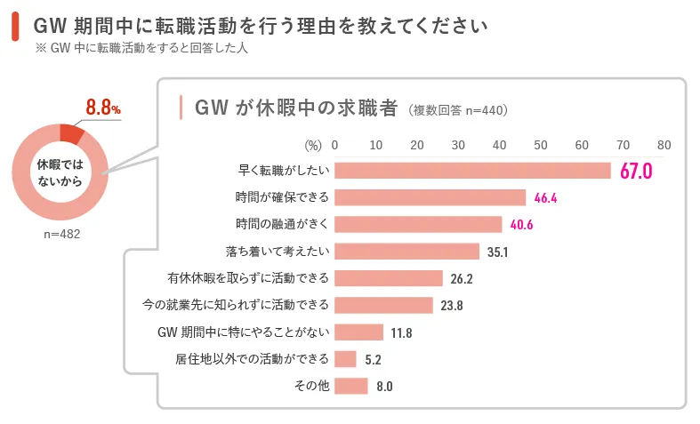 GW期間中に転職活動を行う理由は、「早く転職がしたい」が67.0%と最も高く、強い転職意向が伺えました。次いで「時間が確保できる」(46.4%)、「時間の融通がきく」(40.6%)の順となりました。