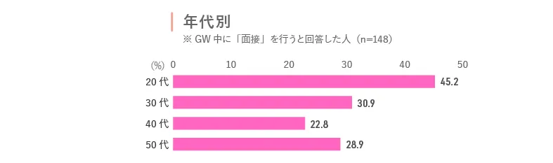 それらの理由から、休暇中に実施する活動内容は、個人で完結する「求人探し」(81.8%)や「応募活動」(60.5%)などが上位を占める結果が見られます。一方で、面接を受ける予定の求職者も3割以上(30.6%)存在し、年代別に見ると、20代が45.2%と最も高い結果となりました。