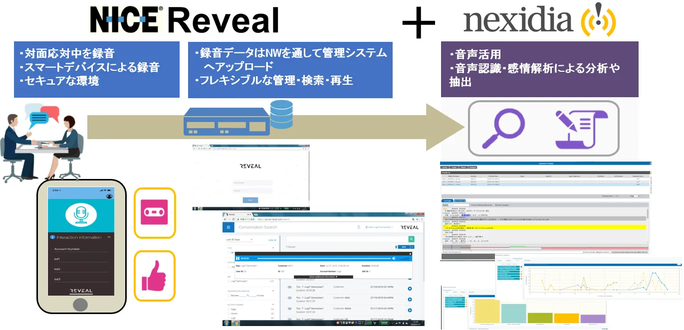 「Reveal」で録音した音声データを「nexidia」に取り込むことにより、キーワードによるデータ検索や大量の音声データの分析が可能となり、結果をマーケティングや業務改善に役立てることができます。