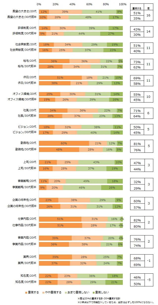 転職先を選ぶ際、20代は30代前半よりも「裁量の大きさ」「評価制度」「社会貢献度」「給与」「休日」を重視。