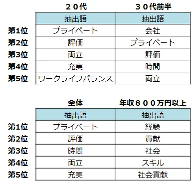 ■ 20代が考える理想の働き方、キーワードは「プライベート」「評価」「両立」。年収が高いほど「社会貢献」が上位に。