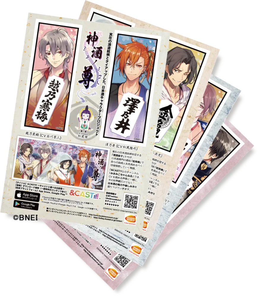 『神酒ノ尊-ミキノミコト-』とは、(株)バンダイナムコエンターテインメントが進める、日本酒の世界と、その世界観を連携し展開する、日本酒キャラクタープロジェクトです。本プロジェクトでは実在の日本酒銘柄を冠するキャラクター「清酒皇子(せいしゅのみこ)」たちが、大繁華街「八宵町(やよいまち)」にある酒処「松宵庵