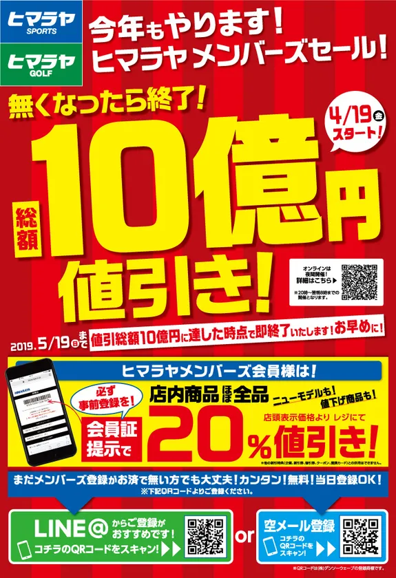 スポーツ用品小売業の株式会社ヒマラヤ(本社:岐阜県岐阜市、代表取締役社長COO:後藤 達也)は、2019年4月19日(金)より「総額10億円値引き!ヒマラヤメンバーズセール」を開催します。